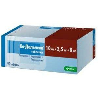 Ко-Дальнева® - комбинированный препарат, содержащий периндоприла эрбумин (ингибитор ангиотензинпревращающего фермента (А11Ф)), индапамид (тиазидоподобный диуретик) и амлодипин (блокатор quot;медленныхquot; кальциевых каналов (ВМКК)).