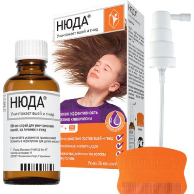 комплекте с инструкцией, распылителем и расчёской для вычёсывания вшей, их личинок и гнид