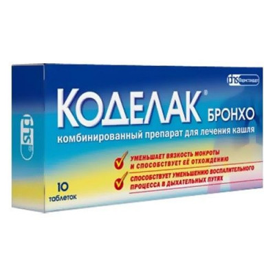 Комбинированный препарат для лечения кашля, оказывает муколитическое и отхаркивающее действие, а так же обладает противовоспалительной активностью. Действие Коделак® Бронхо обусловлено фармакологическими свойствами его компонентов: Амброксол обладает секретомоторным, секретолитическим и отхаркивающим действием, нормализует нарушенное соотношение серозного и слизистого компонентов мокроты, увеличивает секрецию сурфактанта в альвеолах. Уменьшает вязкость мокроты и способствует ее отхождению.