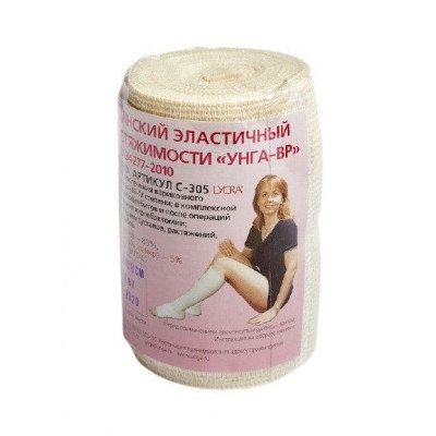 Бинт медицинский эластичный «УНГА-ВР» (II-ой класс компрессии) предназначен для лечения варикозного расширения вен III, IV степеней; в комплексной терапии тромбофлебитов, после склерозирования и флебэктомии; при лечении растяжений, травм суставов (вывихов, ушибов).