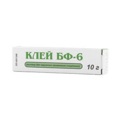 Клей БФ-6 обладает ранозаживляющим и антисептическим действием. Используется как изолирующее средство, способствует заживлению мелких кожных ран вследствие образования на их поверхности изолирующей пленки. Пленка эластична и устойчива к механическим и химическим воздействиям.
