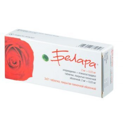 При приеме препарата Белара® наиболее часто встречающимися нежелательными реакциями (более 20% случаев) являются «прорывные» кровотечения, кровянистые выделения из влагалища, головная боль и неприятные ощущения в области молочных желез. Частота ациклических кровотечений обычно уменьшается по мере увеличения продолжительности приема препарата Белара®. Могут наблюдаться нежелательные реакции со стороны следующих органов и систем: - Инфекционные и паразитарные заболевания Нечасто: кандидоз влагалища. Редко: вульвовагинит. - Доброкачественные, злокачественные и неуточненные новообразования (включая кисты и полипы) Нечасто: фиброаденома молочной железы. - Нарушения со стороны иммунной системы Нечасто: гиперчувствительность к компонентам препарата, включая аллергические реакции со стороны кожи. - Нарушения со стороны обмена веществ и питания Редко: повышение аппетита. - Нарушения психики Часто: подавленное настроение, нервозность, раздражительность. Нечасто: снижение либидо. - Нарушения со стороны нервной системы Часто: головокружение, мигрень (и/или ее усиление). - Нарушения со стороны органа зрения Часто: расстройства зрения. Редко: конъюнктивит, непереносимость контактных линз. - Нарушения со стороны органа слуха и лабиринтные нарушения Редко: внезапная потеря слуха, шум в ушах. - Нарушения со стороны сосудов Редко: повышение артериального давления, снижение артериального давления, сердечно-сосудистый коллапс, варикозная болезнь вен, тромбоз вен, венозная тромбоэмболия, артериальная тромбоэмболия* (* см. подраздел «Описание отдельных нежелательных реакций»). - Нарушения со стороны желудочно-кишечного тракта Очень часто: тошнота. Часто: рвота. Нечасто: боль в животе, вздутие живота, диарея. - Нарушения со стороны кожи и подкожных тканей Часто: угревая сыпь. Нечасто: нарушения пигментации, хлоазма, алопеция, сухость кожи, повышенная потливость. Редко: крапивница, экзема, эритема, кожный зуд, усиление псориаза, гипертрихоз. Очень редко: узловатая эритема. - Нарушения со стороны скелетно-мышечной и соединительной ткани Часто: чувство тяжести. Нечасто: боль в спине, мышечные расстройства. - Нарушения со стороны половых органов и молочной железы Очень часто: выделения из влагалища, дисменорея, аменорея. Часто: боль в нижних отделах живота. Нечасто: галакторея. Редко: увеличение молочных желез, меноррагия, предменструальноподобный синдром. - Общие расстройства и нарушения в месте введения Часто: усталость, отеки, увеличение массы тела. - Лабораторные и инструментальные данные Нечасто: изменение концентрации липидов в крови, включая гипертриглицеридемию. В пострегистрационном периоде применения комбинации хлормадинона и этинилэстрадиола сообщалось о следующих нежелательных реакциях: астения и аллергические кожные реакции, не связанные с нарушениями со стороны иммунной системы. Описание отдельных нежелательных реакций. При применении КОК, в том числе комбинации хлормадинон + этинилэстрадиол, также сообщалось о следующих нежелательных реакциях: - повышенный риск артериальных и венозных тромбозов и тромбоэмболий, включая инфаркт миокарда, инсульт, ТИА, венозный тромбоз, ТЭЛА наблюдался у женщин, принимавших КОК (см. раздел «Особые указания»); - по данным некоторых исследований, длительное применение КОК повышает риск развит