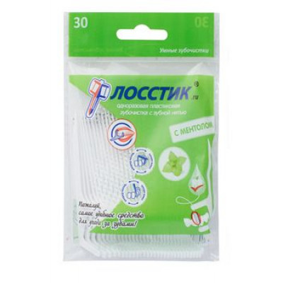 Зубочистка «Флосстик» из высококачественного полиамидного пластика с закреплённой зубной нитью в упаковке по 30 штук, пропитанные вкусом ментола. Зубочистка может быть использована двумя методами, с помощью острого кончика или специальной скрученной зубной нити с восковой пропиткой. Это легкое и удобное средство для полного ухода за всей полостью рта. Умный дизайн ручки позволяет легко приникать в труднодоступные места и очищать зубы от налёта и кусочков пищи. Длина ручки держателя - 8.5 см., длина натяжения нити - 2 см.