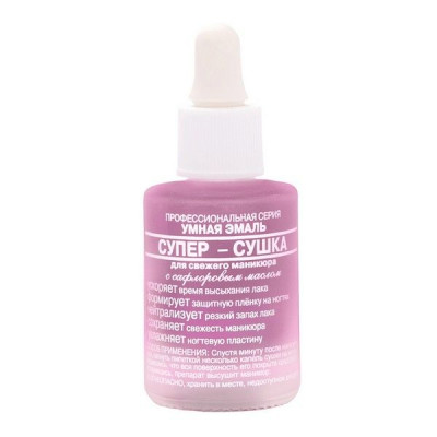 Известно, что лак сохнет слоями. Чтобы многократно сократить время высыхания, нужно использовать препарат quot;Суперсушкаquot; Умная Эмаль. Тонкая пленка на поверхности лака образуется уже от одной капли суперсушки, защищая его от повреждений. При этом высыхание идет равномерно, без сдвига слоев лака. Вы не только не будете страдать от сильного запаха свежего лака, но и приобретете крепкие, здоровые ногти, благодаря идеальной формуле и сочетанию ингредиентов.