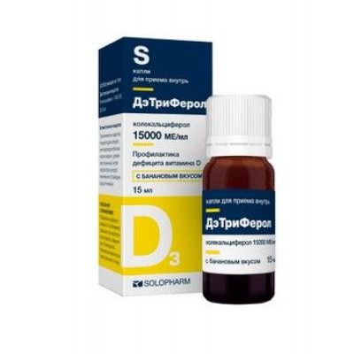 Капли для приема внутрь, с анисовым вкусом, с банановым вкусом, 15000 МЕ/мл. По 10, 15, 20, 25 или 30 мл во флаконы из окрашенного стекла с пробкой-капельницей и крышкой навинчиваемой с механизмом защиты от детей или без механизма защиты от детей. По 1 флакону вместе с инструкцией по применению в пачке из картона.
