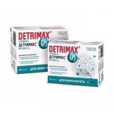 ДЕТРИМАКС® ВИТАМИН Д3 содержит витамин D3 (холекальциферол) – жизненно важный жирорастворимый витамин, необходимый для обеспечения деятельности практически всех органов и систем человеческого организма. Витамин D способствует: Поддержанию здоровой иммунной функции. Укреплению костно-мышечной системы. Повышению энергетического потенциала организма. Поддержанию нормальной деятельности нервной системы. Поддержанию нормальной репродуктивной функции, как у женщин, так и у мужчин. Жирорастворимый витамин D хорошо усваивается в желудочно-кишечном тракте за счет образования в среде тонкого кишечника мицеллярных соединений. Биологически активная добавка к пище. Не является лекарственным средством.