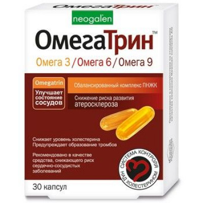 Эффективный сбалансированный комплекс полиненасыщенных жирных кислот (ПНЖК) нового поколения с высоким содержанием Омега-3, способствующий улучшению функционального состояния сосудов, нормализации обмена липидов, повышению иммунного и антиоксидантного статуса. Снижает риск развития атеросклероза, гипертонии, тромбообразования и других сердечнососудистых заболеваний. Омега-3 тормозит образование холестерина в организме, снижает уровень холестерина в сыворотке крови, предупреждая развитие атеросклероза. Омега-6, входящая в состав, необходима для правильного обмена веществ, участвует в утилизации жира и укреплении мышечной ткани. Омега-9 замедляет окисление холестерина и препятствует его осаждению на сосудистой стенке. Является источником энергии для нормальной работы сердечной мышцы.